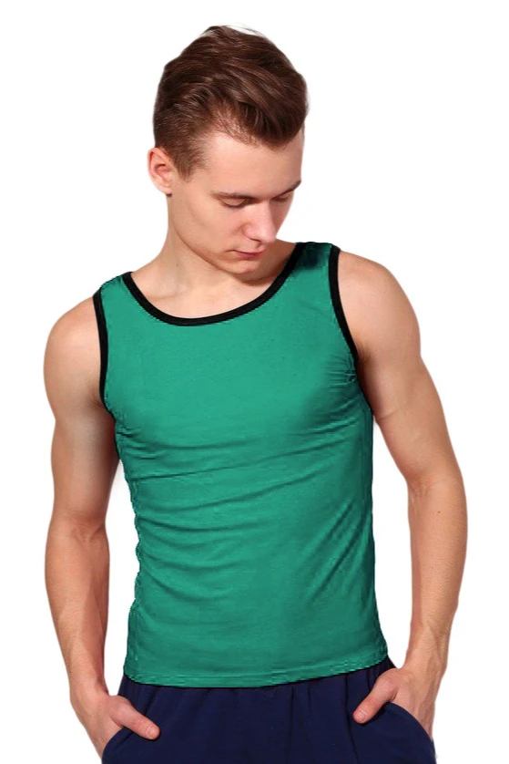 Модель. Майка с прямым силуэтом. Пройма рукавов и горловины обработаны руликом (кант из основной ткани) в цвет майки или отличным от майки цветом. Майка имеет боковые швы без разрезов по низу изделия. Форма ворота О или V-образная.