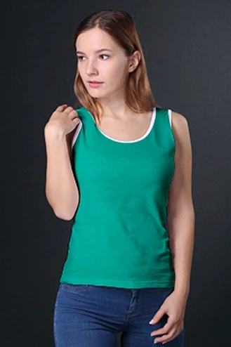 Модель. Майка с приталенным силуэтом. Пройма рукавов и горловины обработаны руликом (кант из основной ткани) в цвет майки или отличным от майки цветом. Майка имеет боковые швы без разрезов по низу изделия. Форма ворота О или V-образная.
