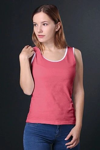Модель. Майка с приталенным силуэтом. Пройма рукавов и горловины обработаны руликом (кант из основной ткани) в цвет майки или отличным от майки цветом. Майка имеет боковые швы без разрезов по низу изделия. Форма ворота О или V-образная.