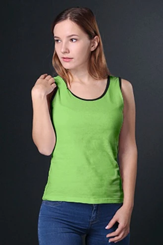 Модель. Майка с приталенным силуэтом. Пройма рукавов и горловины обработаны руликом (кант из основной ткани) в цвет майки или отличным от майки цветом. Майка имеет боковые швы без разрезов по низу изделия. Форма ворота О или V-образная.