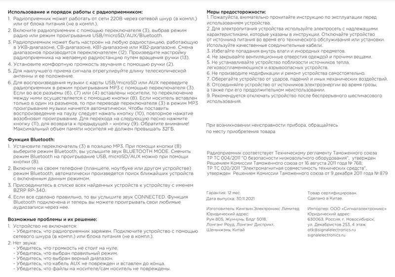 Инструкция Радиоприемник "БЗРП РП-340"