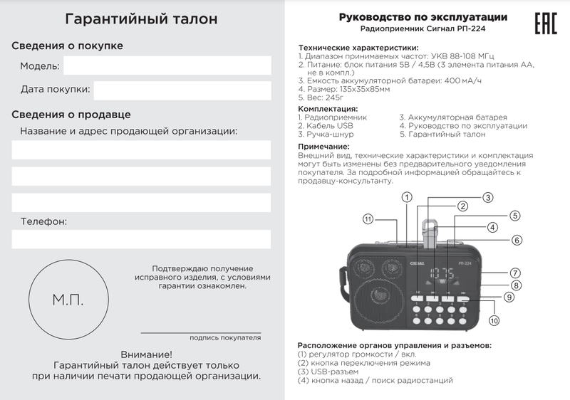 Инструкция Радиоприемник "Сигнал РП-224"