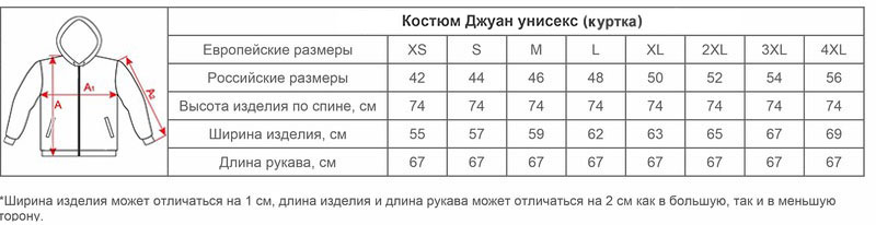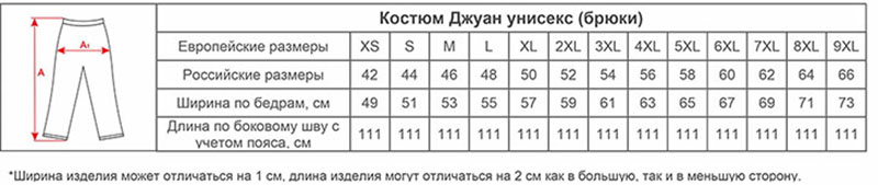 Размеры костюмов Джуан унисекс