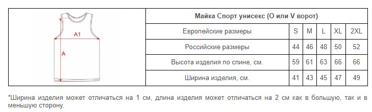 Размеры маек Спорт унисекс