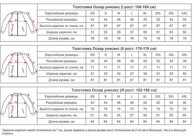 Размеры толстовок Оскар унисекс